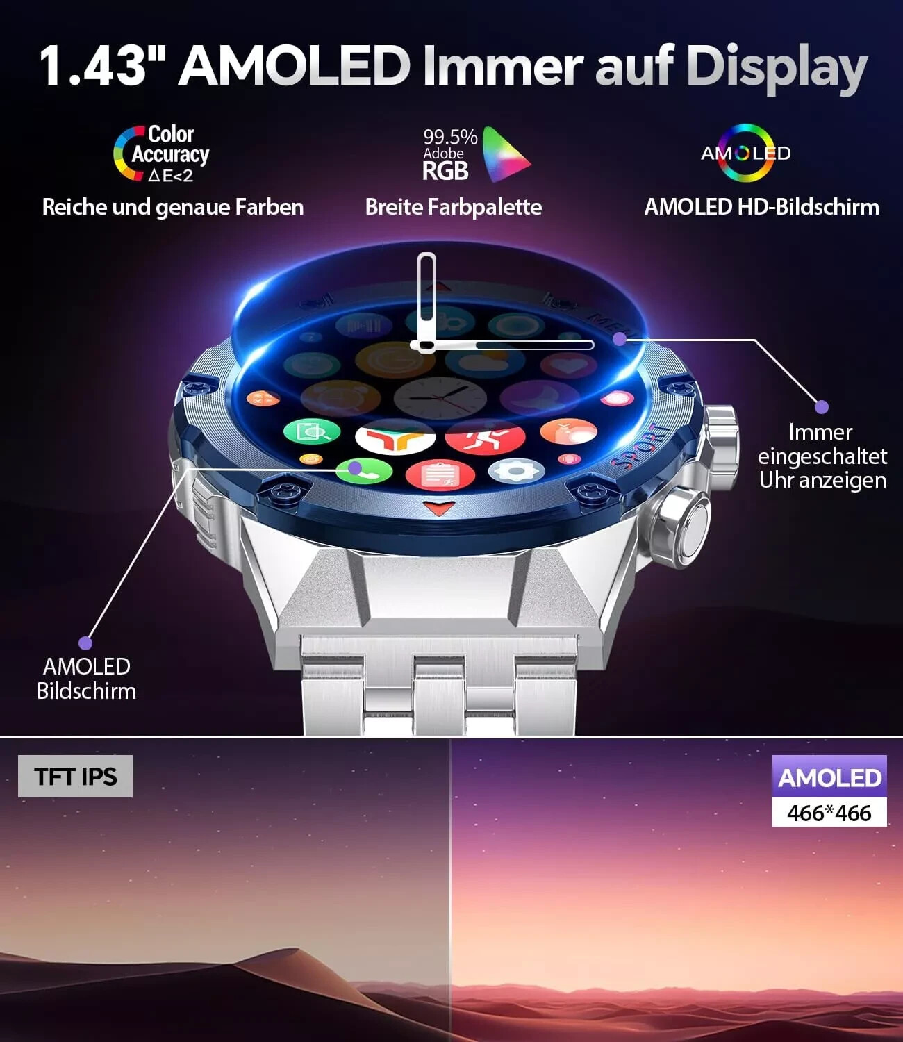 Smartwatch Herren mit AMOLED Touchscreen Telefonfunktion Sportmodi Wasserdicht